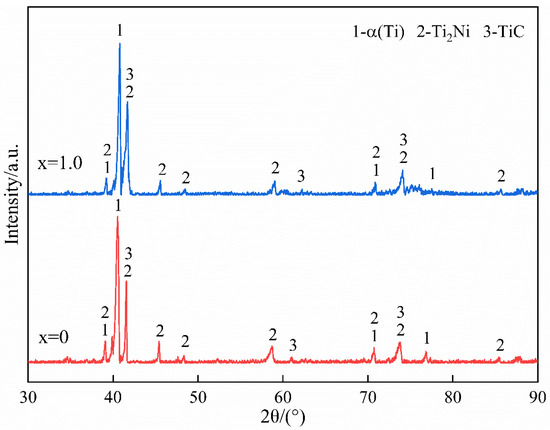 The XRD patterns of the CoCrFeNi and CoCrFeNiAl alloy coatings are presented in Figure 2. By using Jade 6.5 software, the d values of α(Ti) (NO.00-001-1198), Ti2Ni (NO.00-018-0898), and TiC (NO.00-001-1222) can be consistent with those of the diffraction peaks. With regard to the intensities of the corresponding peaks, a conclusion can be drawn that α(Ti) and Ti2Ni are synthesized as the matrix phase, and a small amount of TiC is also precipitated during solidification. The synthesized phases are all rich in Ti, indicating that a portion of the substrate suffers from melting, and the major element (Ti) in the substrate enters into the molten pool and participates in chemical reactions. The elements in the cladding material mostly exist in the form of solutes. By comparing the two diffraction patterns, the two strong peaks located at 2θ = 40.545° and 2θ = 41.568° slightly shift to the left with the introduction of Al, indicating that the lattice is expanded on the basis of Bragg’s equation (). This phenomenon should be attributed to the atomic radius of Al being larger than those of Co, Fe, and Ni (Al: 1.82 Å, Co: 1.67 Å, Fe: 1.72 Å, and Ni: 1.62 Å). The produced solid solution strengthening promotes an improvement in the hardness and wear resistance of the coatings.