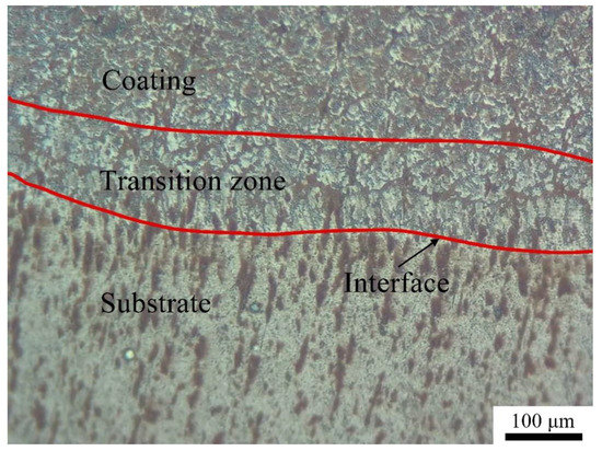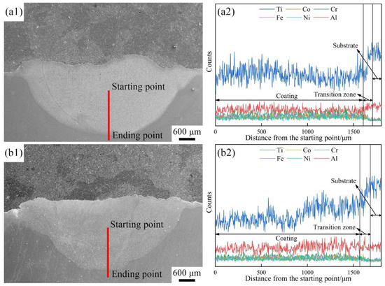 Figure 3(a1,b1) show the cross-sectional macromorphologies of the coatings. The profiles of the two coatings are highly similar. The maximum width and depth are approximately 6.6 mm and 3.0 mm, respectively. The microstructure is extremely dense, and no cracks, pores, and unmalting particles can be clearly identified. A concave interface between the coating and the substrate can be observed, showing that a strong metallurgical bond formed between the two. Linear scanning analyses were performed to detect the change in chemical composition along the scanning trace (Figure 3(a1,b1)). Based on the linear scanning results (Figure 3(a2,b2)), the coating and the substrate can clearly be identified due to the significant change in chemical composition in the joint interface. A close inspection reveals that a transition zone with a thickness of approximately 100 μm can be clearly identified in the joint interface, in which the elements of Ti and Al, rich in the substrate, present the gradual upward tendency and the elements of Co, Cr, Fe, Ni, rich in the cladding material, demonstrate the opposite change along the depth direction of the coatings. The morphology of the interface is indicated in Figure 4, in which the microstructure in the transition zone is different from that in the coating. The zone was also observed in the interface of explosively welded bronze–carbon steel [45], in which the alloying elements of the flyer and base plates were involved. The investigation indicated that a thin transition can also be formed in the interface between the precipitates and the matrix during casting and cooling in the CrFeNiMn0.5Cu0.5 high entropy alloy [46].