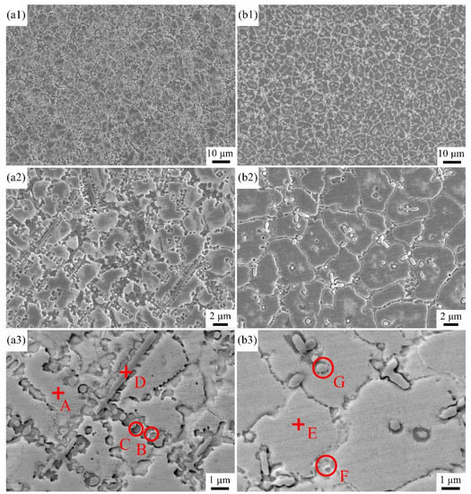 SEM and BSE images of the microstructure of the coatings: (a1–a3) coating without Al and (b1–b3) coating with Al.