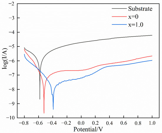 - The coatings exhibited more outstanding corrosion resistance than the substrate in the 3.5 wt.% NaCl solution due to their lower corrosion potential, corrosion current density, and current density in the stable stage. The introduction of Al accelerated the formation of the oxidation film and reduced its cracking susceptibility, further improving corrosion resistance.
