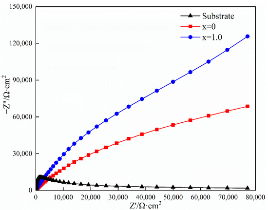 In order to investigate the stability of the passive film formed on the surfaces of three samples, Nyquist plots were recorded (Figure 7). The incomplete depressed semicircles can clearly be observed. The diameter of the semicircles is related to the charge transfer resistance, which is responsible for the stability of the passive film. The large diameter means that the passive film with high stability is formed and demonstrates strong resistance to charge transfer. Consequently, the sample shows excellent corrosion resistance. It can be concluded that the CoCrFeNiAl coating possesses the best corrosion resistance, followed by the CoCrFeNiAl and the substrate. The result is also in agreement with that obtained in the potentiodynamic polarization test.