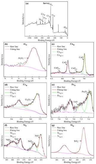 Fitting results of the peaks of (a) survey spectrum, (b) Al2p, (c) Co2p, (d) Cr2p, (e) Fe2p, (f) Ni2p, and (g) Ti2p recorded on the CoCrFeNiAl coating subject to the corrosion tests.