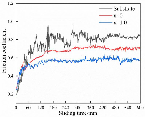 Figure 9 show the change in the friction coefficient of the samples with sliding time in the 3.5 wt.% NaCl solution. Two stages can be clearly identified, namely, the initial and stable wear stages. The friction coefficient exhibits an upward tendency in the former but is maintained at a relatively stable level in the latter. The friction coefficient of the substrate fluctuates drastically with sliding time and presents a higher average value of approximately 0.82 when compared with that of the coatings (0.63 in average value). This result indicates that the coatings exhibit a better anti-friction effect, contributing to the improvement in wear resistance. The phenomenon is mostly associated with the difference in microhardness between the substrate and the coatings. With respect to the substrate with low hardness (340 HV0.2), protrusions on the counterpart can be easily impressed onto its surface, considerably enhancing sliding resistance due to a significant increase in the contact area between the two. In accordance with the formula , the friction coefficient is correspondingly improved for a given applied load. The sharp protrusions will produce microcutting on the substrate surface, and the blunt protrusions may cause different levels of plastic deformation of the microzones. The substrate surface is in a considerably unstable state, causing a drastic change in friction coefficient with sliding time. The hardness of the coatings is significantly improved by approximately 110% (713 HV0.2) compared with that of the substrate (340 HV0.2), implying that their resistance to plastic deformation and microcutting is also considerably increased. A clear examination shows that the introduction of Al can reduce the average friction coefficient from 0.695 to 0.578. Such reduction should be attributed to the improvement in microstructural uniformity.