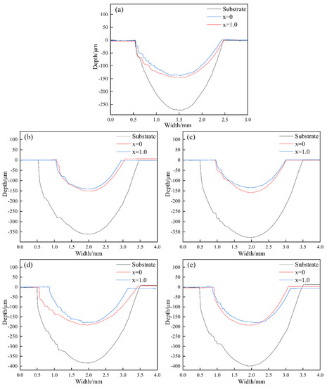 Wear profiles of the samples: (a) 2, (b) 4, (c) 6, (d) 8, and (e) 10 h.