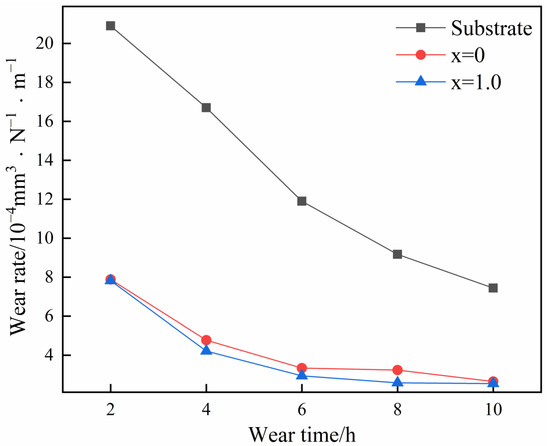 The wear profiles of the samples subject to wear at 2, 4, 6, 8, and 10 h are presented in Figure 10. On the basis of the wear volume obtained from Figure 10, the wear rate (Table 4) is further calculated using Formula (1). The relationship between wear rate and sliding time is clearly illustrated in Figure 11. With regard to the substrate, the wear rate exhibits an approximately linear reduction tendency with sliding time. The wear rate is reduced from 2.09 × 10−3 mm3·N−1·m−1 for the initial 2 h to 7.44 × 10−4 mm3·N−1·m−1 for 10 h, implying that the substrate is in a break-in state. For the two coatings, their average wear rates (7.85 × 10−4 mm3·N−1·m−1 for the initial 2 h to 2.60 × 10−4 mm3·N−1·m−1 for 10 h) are considerably reduced by approximately 62.4% and 65.1% compared with those of the substrate at the same sliding time. Moreover, the reduction in wear rate is significantly slowed down when sliding time exceeds 4 h, and the value is maintained at a comparatively stable level of 2.88 × 10−4 mm3·N−1·m−1 along with prolonging sliding time, indicating that the coatings have transitioned into the stable wear stage. The change in wear rate with sliding time is extremely similar for the two coatings, and a slight reduction in wear rate occurs when introducing Al (Δwear rate = 0.2 × 10−4 mm3·N−1·m−1). The results indicate that hard coatings can shield the soft substrate from serious wear and facilitate its rapid transition into the stable wear state. The introduction of Al can improve the wear resistance of the coating to a certain extent.
