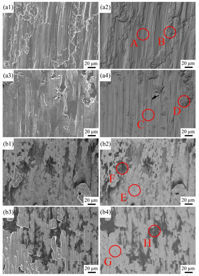 SEM and BSE images of the wear morphologies of the samples: the substrate of (a1,a2) for 2 h and (a3,a4) for 10 h; the CoCrFeNiAl coating of (b1,b2) for 2 h and (b3,b4) for 10 h.