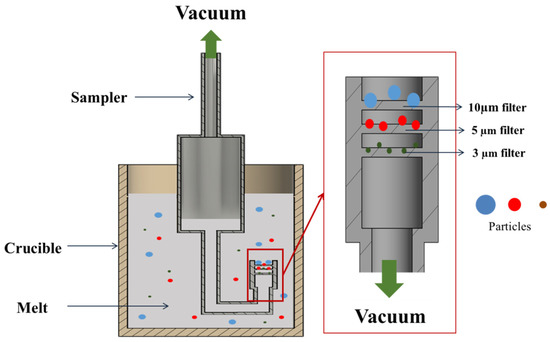 Figure 5 shows the cooling curve of the samples. The nucleation in the solidification of the molten metal can be evaluated by the cooling curve. A phenomenon in which the temperature of a liquid becomes lower than its equilibrium melting temperature is called that the liquid is undercooled, and the degree of undercooling (ΔT) is the equilibrium melting temperature minus the actual temperature of the liquid. If the alloy has sufficiently nucleation sites, the degree of undercooling is reduced because the solid phase is formed from the liquid phase only with low thermodynamic driving forces [2,3,4,31,32]. In the HP AZ91 alloy, almost no undercooling was observed regardless of whether or not the overheating process was performed. It was thought that the HP AZ91 alloy originally had nucleation sites that gave itself grain refining and that the superheating process had no effect on the grain refining efficiency of these nucleation sites, affecting the grain refinement of the HP AZ91 alloy, as shown in Figure 5. On the other hand, in the CP AZ91 alloys, undercooling of 1.3 °C was observed before superheating and a negligible undercooling was observed after superheating. It might be considered that nucleation sites that give the grain refinement to the CP AZ91 alloy were generated during the superheating process. However, the long holding at the general pouring temperature (670 °C) deteriorates the grain refining effect of these nucleation sites, so it is thought that the grain size of the CP AZ91 alloy refined by superheating goes back to its original grain size again, as shown in Figure 3. Nucleation sites generated by superheating are likely to be a particle existing in the molten metal of the CP AZ91 alloy, and an experiment was devised to take out particles from the melts to observe these particles.