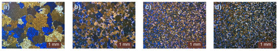 Influence of superheating on the grain size for (a) CP AZ91 (AGS: 332 µm), (b) CP AZ91 SH (AGS: 169 µm), (c) HP AZ91 (AGS: 98 µm), and (d) HP AZ91 SH (AGS: 87 µm).