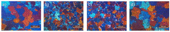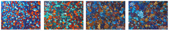 Influence of superheating and holding on the grain size for (a) HP AZ91 (AGS: 70 µm), (b) HP AZ91 SH (AGS: 89 µm), (c) HP AZ91 SH-1h (AGS: 69 µm), and (d) HP AZ91 SH-2h (AGS: 70 µm).
