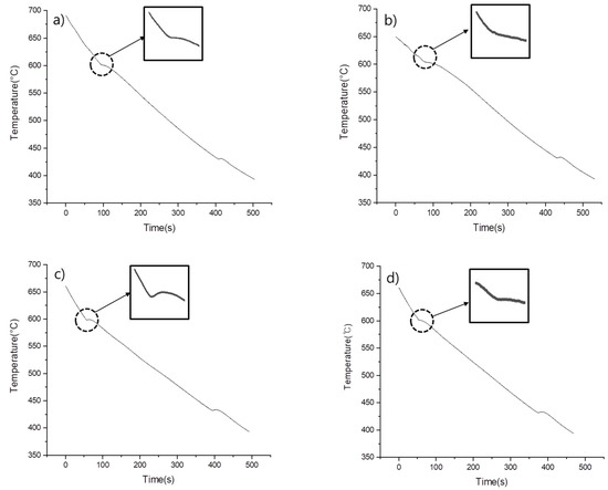 The cooling curves of (a) HP AZ91 before superheating, (b) HP AZ91 after superheating, (c) CP AZ91 before superheating, and (d) CP AZ91 after superheating.