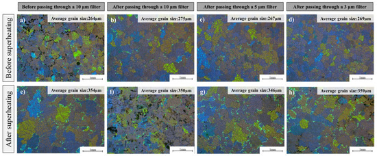 The microstructure of the CP AZ91 samples filtered through porous filters in the vacuum sampler: before superheating—(a) before passing through a 10 µm filter, (b) after passing through a 10 µm filter, (c) after passing through a 5 µm filter, (d) after passing through a 3 µm filter and after superheating, (e) before passing through a 10 µm filter, (f) after passing through a 10 µm filter, (g) after passing through a 5 µm filter, and (h) after passing through a 3 µm filter.