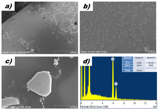 Intermetallic compounds of CP AZ91 filtered through a 10 µm filter (a) before superheating and (b) after superheating; (c) Al-Mn intermetallic compound of sample before superheating; (d) EDS analysis for Al–Mn intermetallic compound of sample before superheating.