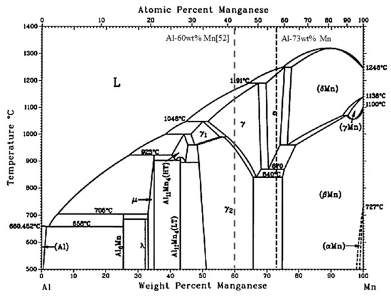 Cao and co-workers [37] studied the effect of manganese on the grain refinement of Mg–Al-based alloys. It was shown that the grain size of the Mg–Al alloys was clearly reduced by the addition of Al-60 wt.% Mn master alloy splatter (according to the specification provided by the supplier, the actual composition varied from 58 to 64 wt.% Mn). XRD results indicate that the Al-60 wt.% Mn master alloy contained ε-AlMn particles that have very good crystallographic matching with α-Mg [37]. Thus, they concluded that ε-AlMn particles could possibly act as the effective nucleation sites for α-Mg. Based on the Al–Mn binary phase diagram (Figure 8), this phase is not formed in the Al-60 wt.% Mn master alloy splatter. However, they suggested [37] three possibilities for how the ε-AlMn could be formed during rapid cooling of the Al-60 wt.% Mn melt. First, the actual chemical composition of the Al-60 wt.% Mn master alloy splatter could be up to 64 wt.% Mn, according to the composition analysis data from the supplier. Second, the rapid cooling process inhibits the formation of the γ2-Al8Mn5 phase compared to the ε-AlMn phase, which shifts the peritectic reaction (L + ε → γ2) to a lower temperature. Third, the binary Al-Mn phase diagram is not well established yet, especially in relation to high-temperature regions.