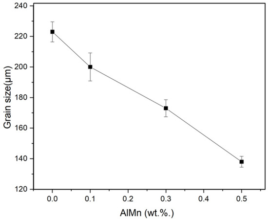 Grain size of the CP AZ91 Mg alloy with 0.1 wt.% to 0.5 wt.% Al-Mn master alloy ribbons.