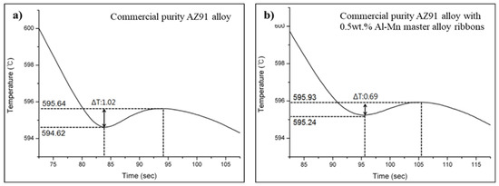 Typical cooling curves of (a) CP AZ91 alloy and (b) CP AZ91 alloy with 0.5 wt.% Al–Mn master alloy ribbons.
