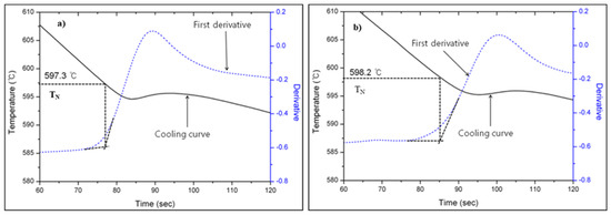 (a) TN of the cooling curve of (a) the CP AZ91 alloy and (b) the CP AZ91 alloy with 0.5 wt.% Al–Mn master alloy ribbons.