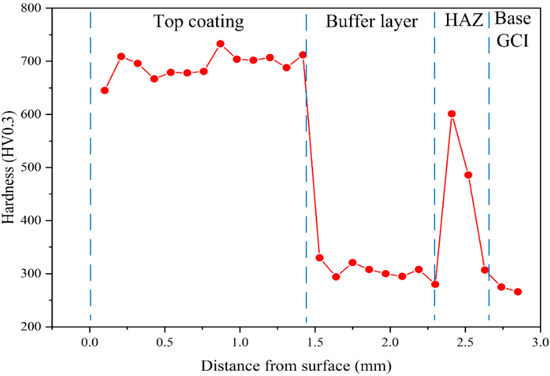 A LASERTEC 65 3D hybrid machine (DMG MORI AG, Bielefeld, Germany) with a 2500 W diode laser (λ = 1020 nm) and a coaxial powder nozzle was used for the coating depositions. The laser spot had a diameter of 3 mm and a focal length of 13 mm, with a top-hat beam profile. A laser power of 1400 W and scanning speed of 1200 mm/min were used in the coating process. The powder feed rate was set to 14 g/min, with argon serving as the carrier gas at 5 L/min and the shielding gas at 5.5 L/min. A Future-Tech microhardness tester (FM-310, Future Tech Corporation, Kawasaki, Japan) was used to assess the microhardness of the polished cross-section of the coatings, from the top of the surface down to the GCI substrate, at a force load of 300 g and a 10 second indentation duration. The hardness survey was performed from the surface onward to better understand the changes in the different layers, with a set of indentations spaced 0.15 mm apart from one another.