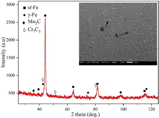 XRD pattern of the disc’s top layer surface. Inset: SEM image of the top layer, showing the microstructure of the analyzed surface, with the indication of the points “A” and “B”, where EDXS analyses were carried out to evaluate the local composition (see Table 3).