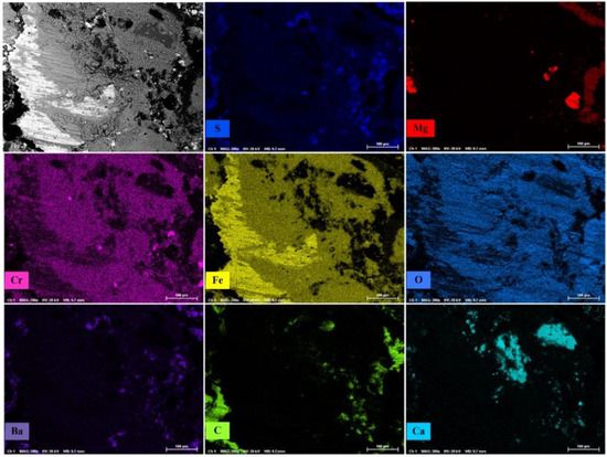Figure 8 shows SEM micrographs of the worn-out pin and the counterpart disc surfaces after the PoD tests. The typical features of the friction layer can be seen in the planar view of the pin surfaces (Figure 8b,d), which consists of primary plateaus, mostly made up of metallic fibers (brighter phases), and secondary plateaus, made up of wear debris accumulated and compacted against primary plateaus (gray features against bright primary plateaus). The secondary plateaus on friction material “B”’s surface are more extended, but appear to be less compacted, as shown in Figure 8d. On the other hand, the secondary plateaus are less extended and more compacted on the pin surface of friction material “A” (Figure 8b). On the wear track of the counterpart discs, a material transfer is observed, which for friction material “A” (Figure 8a) is more widespread than for friction material “B”. In friction material “B”, the presence of barite contributes significantly to the establishment and extension of secondary plateaus [27]. This element can be found in the friction layer on the pin surface and the transferred layer on the disc, as illustrated by the EDXS results in Table 5. The X-ray element distribution maps of friction material “B” and the disc are shown in Figure 9 and Figure 10. The secondary plateaus right behind the primary plateaus are enriched with Fe, O, and Cr originating from both the pin and the coating composition. Some Ba is also detected, in line with the results of a previous study [27,28], and in agreement with the EDXS analysis of the highlighted area in Figure 8 (Table 5). The significant material transfer is responsible for the higher friction coefficients measured for these pairings compared to those observed in the case of the uncoated GCI disc, which were around 0.5 (Table 6) [27,28]. The material transfer is due to the high coating hardness, and results in an increase in the adhesive contribution of the friction coefficient and, in turn, higher emissions.