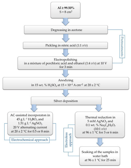 All experimental procedures are schematically represented in detail in Figure 1. Aluminum sheets corresponding to standard EN 573-3/485-2 (Si ≤ 0.25 wt. %, Zn ≤ 0.07 wt. %, Mg ≤ 0.05 wt. %, Cu ≤ 0.05 wt. %, Ti ≤ 0.05 wt. %, Mn ≤ 0.25 wt. %, Fe ≤ 0.4 wt. %, other ≤0.03 wt. %, Al bal.) were cut into samples with active working area of 8 cm2, distributed on both sides of each specimen. Prior to anodization, three different pretreatment steps were performed. The anodic oxidation was completed in a two-electrode cell (with a lead plate as a counter electrode, placed symmetrically around Al anode) for 30 and 60 min. After that, two non-identical silver deposition techniques were used—AC-electrochemical incorporation and in situ thermal reduction. All specimens were repeatedly washed with double-distilled water and dried in air after each operation. For the preparation of all solutions, analytical-grade reagents were employed.