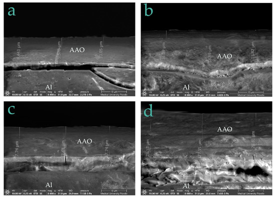 The comparison between the images establishes a slightly lower thickness of the unsealed samples (Figure 2a,c). As can be seen in Figure 2a, the thinnest film (approximately 10 µm) is formed in the acidic bath for 30 min, and on the interface Al/oxide layer the appearance of cracks is observed. A detailed investigation of the surfaces, obtained by the means of this anodic regime, revealed that the oxide layer is irregularly distributed in the edge area, and at the same time, in some places, no cracks or crevices can be seen. Their occurrence is a result of the anodization process parameters and the presence of impurities in the aluminum alloy [10]. At the edges of the metal plates, greater local inhibition of the oxide growth was experienced. More interesting is the fact that when samples of group A were submitted to the sealing procedure, the oxide layer grew (Figure 2b). The same dependence occurred for the metal pads of group B—electroformed layers for 60 min (Figure 2c,d). It is already reported that sealing in aqueous media induces the incorporation of water in the structures [26]. Historically, this is the most common and effective way to improve the corrosion resistance of anodized aluminum. As a consequence of this process, the outer surface and the pore walls react to form a crystalline hydrate known as boehmite. Finally, this inert hydrated oxide fills all of the pores, and provides a protective layer all over the surface [6].