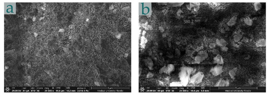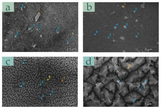 In all the depicted samples, the oxide layers are irregular. With the prolonged anodization and hydrothermal sealing at temperatures above 95 °C, the pores of the oxide skeleton are filled by a crystalline hydrate phase (Figure 4c,d) where silver particles are incorporated. However, uncovered areas were also observed. In Figure 4a,b, Ag is mainly located in the pits and crevice sites of the alumina films. It can be seen both as individual particles and agglomerates. In addition, the dimensions of some species were above nanoscale, and they were not evenly distributed in the anodic coatings. These findings are in agreement with our previous investigation [28]. However, an extended EDX topological analysis revealed small Ag quantities for all samples. In Figure 5, a top-view of the specimens of groups AT-3 and AT-6 at higher magnification are presented. Many silver particles with different sizes can be seen. However, at the same time, in different areas of the same samples, difficulties in locating Ag species occurred. This fact is proof for the low efficiency and repeatability of the electroless deposition method.