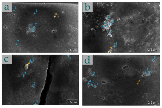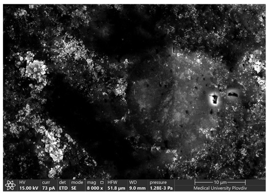 In this study, in situ thermal reduction of Ag+ was performed in order to obtain silver particles with bactericidal activity which were deposited into the porous layers. After that, a hot water sealing procedure was performed. In Figure 4, microphotographs of the as-obtained Ag-doped films are presented. For better detection of the silver, an inspection with the EDX analyzer of the top-view of the surfaces at different magnifications was performed.