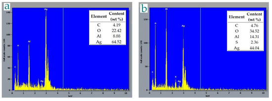 In comparison with the thermal reduction method, silver electroplating resulted in greater Ag content on the alumina substrates, regardless of the alumina thickness (Figure 6). Most saturated with silver surfaces were the oxide layers formed in the acidic bath for 30 min—sample groups AE-0.5 and AE-8. As expected, larger accumulations of Ag deposits were observed on the anodic films which experienced silvering for the longer time periods. Metallic silver clusters are well established in Figure 6b. The Ag content was confirmed by the EDX attachment. Typical EDX spectra are presented in Figure 7. The data observed agree with our preliminary investigations [25] and evince the reproducibility of the electroplating deposition method.