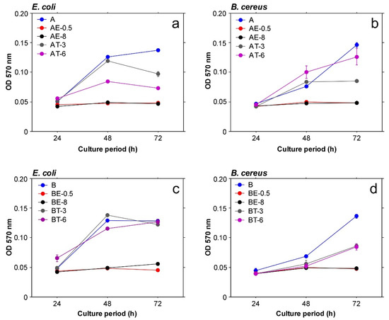 Relative levels of viable E. coli (a,c) and B. cereus (b,d) bacteria during different culture periods in the presence of test specimens.