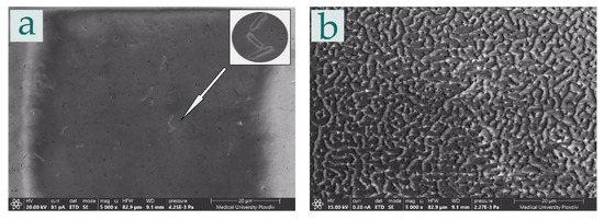 To support the bactericidal efficiency data, SEM analysis was performed. Figure 10 displays metal pads analyzed after antimicrobial assays. The total inhibition of bacterial growth is proven for the electrodeposited silver on the anodic films (Figure 10b). The attachment of E. coli cells after a 24 h cultivation on silver-modified alumina substrates by the electroless approach is presented in Figure 10a.