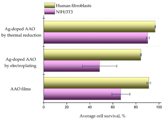 Average cell survival levels determined after 48 h in vitro culture of NIH/3T3 and human fibroblast cells with modified alumina substrates. All samples were tested in duplicates (n = 4). Figure bars represent mean ± standard error of the mean, and ± SD is indicated for each group.