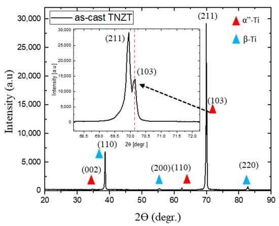 The XRD pattern shown in Figure 2 indicates the presence of martensitic and body-centered cubic Ti in the α′′ and β phases. In the XRD pattern, the peak referring to the (211)β plane, located at 2θ = 69.95°, presented greater intensity than the other peaks. Inside the diffraction pattern, the location of the peak referring to α′′-Ti (103)α, and contained in 2θ = 70.12°, is indicated in more detail. Here, we see that most peaks are related to the β phase.