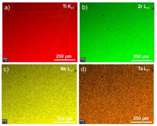 The high-magnification SEM images corresponding to the EDS mapping of as-cast TNZT (see Figure 3a–d) further proved the previous inference in the element distribution of Ti, Nb, Zr and Ta. All the elements presented good distribution and homogeneity to one another, and no regions with high concentrations of elements were found. It is well-known that β phase stability can be achieved by the amount of alloy elements, and also by alloy composition. Nb and Ta are two of the most important β-stabilizing elements that strongly influence the phase transformation of Ti alloys. Sufficient Nb and Ta contents can lead to (Ti, Nb), (Ti-Ta) bcc solid solutions. Zr can be considered a neutral element, it does not significantly affect the Tβ quantity and can be added to metastable β phase Ti alloys. In this case, neutral elements can alter hexagonal isothermal ω phase formation kinetics during aging. However, the role played by Zr as an effective β stabilizer when combined with Nb and Ta is starting to be acknowledged [18]. This can explain the good homogeneity of the elements in the Ti matrix. These data confirm the results obtained by the XRD profiles.