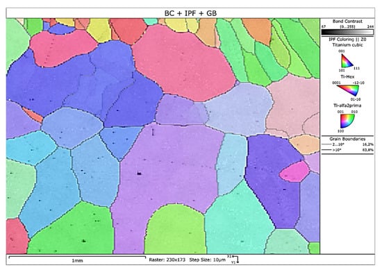 - An Oxford Instruments backscattered electron detector (EBSD) (Symmetry, Oberkochen, Germany) was used to obtain information about the as-cast TNZT crystalline structure. First, samples were prepared by metallographic techniques and a final polish, prior to the analysis, for approximately 5 h with nondried OP-S solution in a vibratory polisher (Struers-Labopol-5). Analyses were carried out in an Aztec HKL Max system (Wiesbaden, Germany). Samples were placed at an inclination of 70° in relation to the detector (Symmetry S2®) (Wiesbaden, Germany) at an acceleration voltage of 20 kV. Three possible phases were selected to be analyzed: β-Ti, α-Ti, martensite α′′-Ti. Patterns were analyzed by the HKL Channel 5 (Oxford Instruments) software (Wiesbaden, Germany).