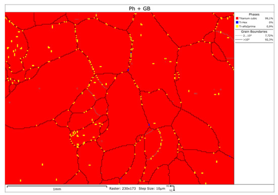 No α-Ti content was detected, and low α′′-Ti content (martensitic structure) was located on the β-Ti grain boundaries, as indicated in Figure 5 in yellow color. This last phase presented small needles morphology, which the XRD pattern was capable of detecting, despite the low content.