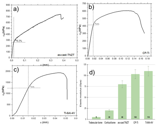 The elastic modulus obtained by ultrasound had a value of approximately 80 GPa, which was 20–25% lower than that of other available alloys [28]. In the literature, some authors have described different elastic modulus values in distinct tooth kinds; e.g., for incisors, premolars and third molars, and elastic moduli ranges in enamel are, respectively, 98.3, 40–80 and 75–90 GPa. The same samples had values of 24.8 GPa, 60–100 GPa in dentin [28,29,30] and no value description for the third molar was found. As previously analyzed, this reduction in elastic modulus denotes a marked change in the transmission of masticatory loads (for dental implants) between bone and the implant. As previously explained, the yield stress of TNZT was slightly lower (without being compromised) than the other employed alloys, and this decrease led, in turn, to a lower Young’s modulus. The combination of both factors highlights this alloy from many others.