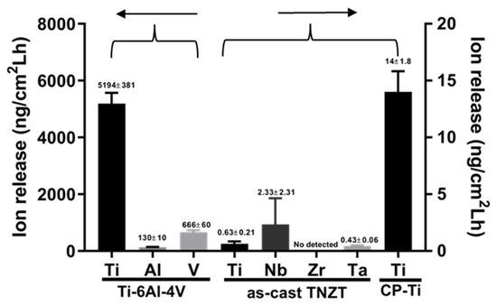 A metal ion release test was carried out for as-cast TNZT, and the CP-Ti and Ti-6Al-4V samples, as controls. It comprises the first step to measure cytotoxicity. First, specimens were cut, subjected to metallographic preparation, and sterilized. The size of the metallic samples was 1.5 cm2 and the contact surface was 0.744 cm2 for all the samples. Once specimens were prepared, a nontoxic electrolyte was required, denominated Ringer-Hartmann and composed of NaCl (5.97 g/L), KCl (0.37 g/L), CaCl2 (0.22 g/L) and C3H5O3xNa (3.25 g/L) in which they were deposited to evaluate the ion release. This is one of the means to measure the samples’ cytotoxicity.