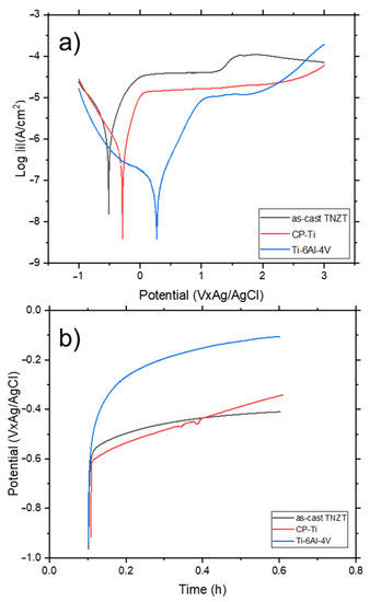 Representation of the OCP (a) and PPCs (b) curves of two cast TNZT alloy samples. The measurements were carried out in Ringer-Hartmann solution (pH = 6.8) at 37 °C.
