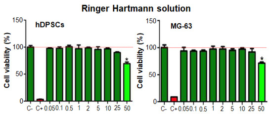 Measurement of the cytotoxicity of Ringer-Hartmann’s solution in cells hDPSCs and MG-63 at different concentrations. * when is p < 0.05.