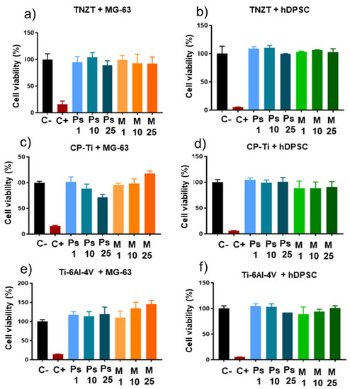 Cytotoxicity testing was carried out on the three different alloys (CP-Ti, Ti-6Al-4V, TNZT) as seen in Figure 10. The software employed for the analysis of the results (GraphPad Prism 7.3) allowed the normalization of all the results from the different tested plates. The control was set at 100% cell viability. The negative control (C-) corresponded to cells hDPSCs and MG-63 cultured with their proliferation medium. In this way, it was possible to compare all the obtained results to the other tested alloy types. The measurements taken of the other wells were also compared to this control, and it was analyzed whether or not there were significant differences between them and the control (*) using the post hoc Tukey test by multiple comparisons. Thus, in those cases with a significant result, a certain degree of cytotoxicity of the ions released by the alloy in question was concluded. Although the modified Ringer-Hartmann (Ps) artificial saliva did not generate any toxic effect, it was tested on each plate to make sure. Latex was employed as a positive control (C+), which was always significant compared to the negative control because it caused cell death. Next, the behavior of the samples corresponding to artificial saliva with the ions released from different alloys (M) was analyzed. Cells hDPSCs in the presence of modified Ringer-Hartmann artificial saliva with released ions showed optimal cell viability in the commercial pure Ti manufactured by forging. These results were used as a control to analyze the influence of the other elements added to Ti in the other alloys. According to Kuroda et al., 1998, cytotoxicity of Al and Va metallic ions was detected in biomedical alloys [3]. Al was the ion released in the most artificial saliva compared to others. The obtained results were similar because it was the same alloy. The cell viability percentages for the three sample contents allowed us to conclude that there was no evidence of the Ti-6Al-4V alloy being cytotoxic for human dental pulp stem cells. The results enabled us to verify that, in the artificial saliva with the ions released from as-TNZT, once again, cells showed cell viability in line with that of those cells in their own proliferation medium. Thus, for cells hDPSCs, it was concluded that none of the three alloys presented relative differences to the control. This study allowed us to affirm that the incorporation of Nb, Zr and Ta into Ti to form the quaternary alloy as-cast TNZT was also positive in cell viability terms. The same analysis was carried out below, but with the MG-63 cell line, to define these alloys’ behavior when they came into contact with similar cells to osteoblasts. The study of these cells’ behavior before the ions were released from the alloys in artificial saliva is most important because, once the dental implant is placed in a patient, the aim is for part of the stem cells of the human dental pulp to differentiate into osteoblasts to promote the implant’s osseointegration with the surrounding bone. First, the alloy generated in the laboratory showed increased proliferation in proportion to the present sample’s increase. It was concluded that this alloy promoted MG-63 cell line growth. The behavior of the pure Ti obtained by forging was the exact opposite. It was maintained at the same levels as the control for the 1% sample but, as the percentage of artificial saliva introduced into dilution rose, cell viability was considerably reduced by 30%. A trend was generated, which allowed us to predict that cells would die as the artificial saliva dissolution with the released Ti ions increased. This is, hence, an indication of the cytotoxicity of this specific CP-Ti sample for MG-63 cells.