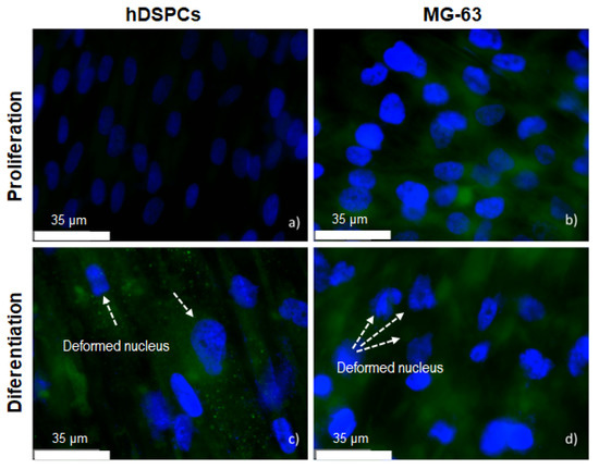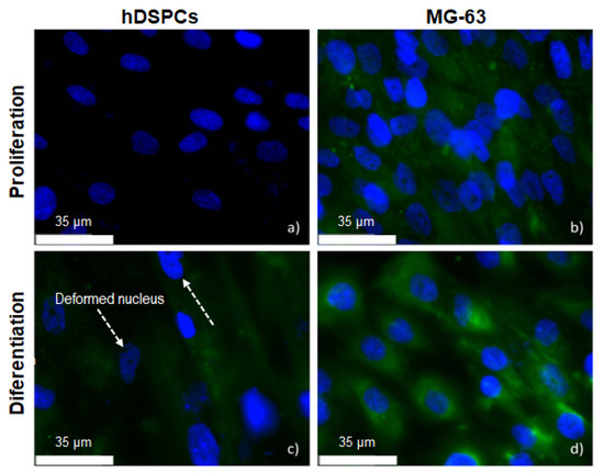 Figure 11 shows the OC expression visualized in green for the hDSPCs and MG-63 cells treated with conventional medium (Figure 11a,b) and differentiation medium (Figure 11c,d) on a flat surface (2D). The nucleus was stained with DAPI (blue) to better identify any cells present. The greater cell proliferation of MG-63 than hDPSCs was initially noted, and OC with a low intensity was detected only in cells MG-63. In the hDPSCs cells with the differentiation medium, a change was noted in the nucleus morphology, which is a clue to indicate that the differentiation process had started.
