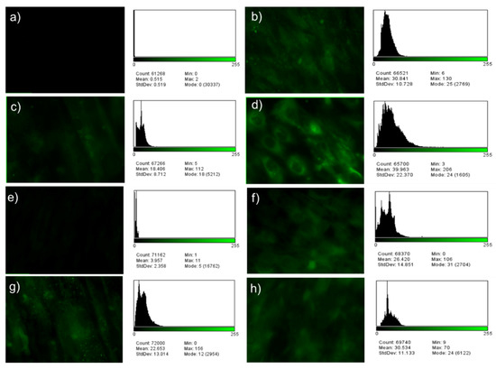 Fluorescence microscopic images and their analysis of histograms using the ImageJ software at 20×, (a–d) are the hDPSCs and MG-63 cells cultivated on flat surfaces in conventional and differentiation media in relation to Figure 11; (e–h) are the hDPSCs and MG-63 cells cultivated on as-cast TNZT surfaces in conventional and differentiation media in relation to Figure 12.