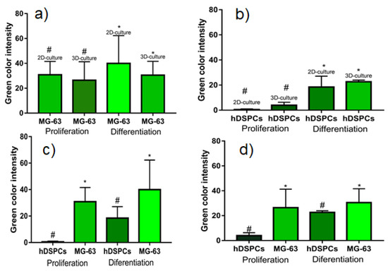 Finally, the comparisons of the green color intensities between the same cell type in platelets in both 2D and 3D are shown in Figure 14a,b. Figure 14c,d quantitatively confirms the increased OC expression in both cells when subjected to the differentiation medium. When evaluating the cellular behavior of cells MG-63, the expression significantly decreased in both the conventional culture and differentiation media. Furthermore, hDPSCs displayed the opposite behavior.
