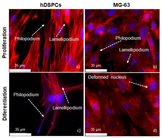The cytoskeleton morphology was wider and more circular than in hDPSCs. In both cells line, cytoplasmic projections were seen, such as lamellipodium and philopodium, which are responsible for creating edges when treated with conventional and osteogenic culture media. Moreso, hDPSCs showed a clearer cytoskeleton and circular-shaped focal adhesions overlapping the cytoskeleton. The same morphology was found for cells MG-63 when treated with the osteogenic medium. Cell adhesion and, consequently, projections are fundamental for influencing nucleus deformation and, consequently, differentiation paths. When treated with osteogenic medium, both cells presented a deformed nucleus and a wider spread morphology on a flat surface.