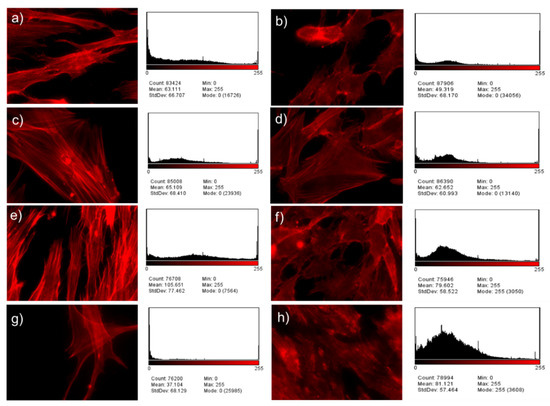Fluorescence microscopic images stained for the cytoskeleton and their analysis with histograms employing the ImageJ software at 20×, (a–d) are the hDPSCs and MG-63 cells cultivated on flat surfaces in conventional and differentiation media in relation to Figure 15; (e–h) are the hDPSCs and MG-63 cells cultivated on as-cast TNZT surfaces in conventional and differentiation media in relation to Figure 16.