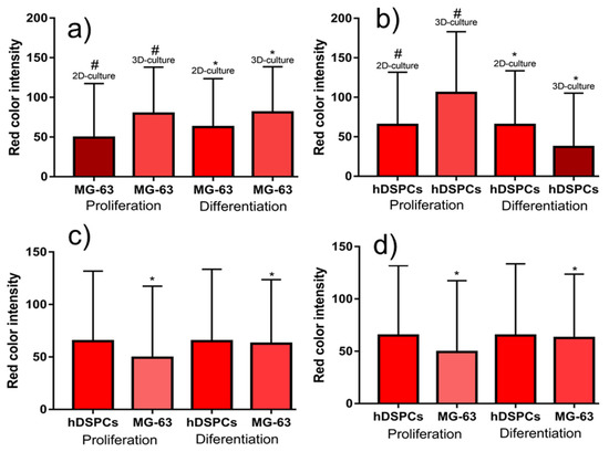 F-actin was quantified by the comparisons made between the same cell line on 2D (a) and 3D surfaces (b). F-actin intensity color was also used in the comparisons between the same cell line (MG-63) (c), (hDPSCs) (d). # and * when p < 0.05.