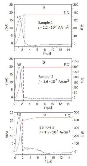 Figure 1. Oscillogram curves of the current I(t) passing through the wires and the energy E(t) introduced into the wires for samples from Table 1: (a) sample 1; (b) sample 2; (c)—sample 3.