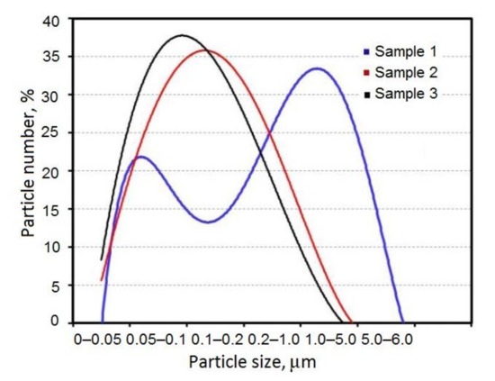 Analysis of the particle size distribution (Figure 2) showed that at a minimum energy introduced into the wire being 147 J (Sample 1), both nanoparticles and microparticles are formed. The size distribution curve displays two maxima (bimodal powder), the first of which is in the region of nanosizes (59 nm), and the second, in the region of micron (2 µm) sizes (Table 2). The energies being 292 J and 430 J (Sample 2 and 3), the size distribution curves display one maximum (monomodal distribution) at 132 and 95 nm, respectively. As the energy E transferred to the wires increases, the maximum of the distribution functions shifts to a region of smaller sizes.