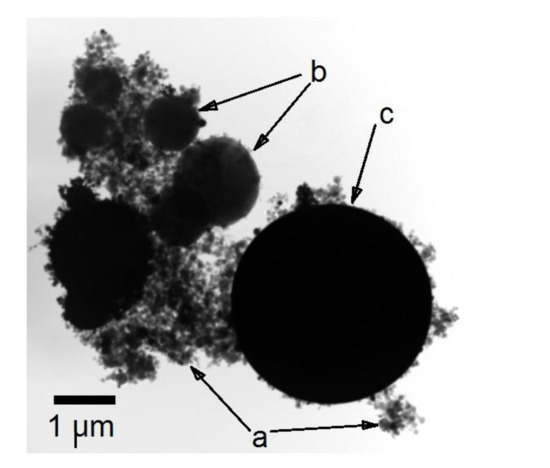 Figure 3. TEM images of the particles obtained at E(t) = 147 J (Sample 1): a—nanoparticles, b—submicron particles, с—microparticles.