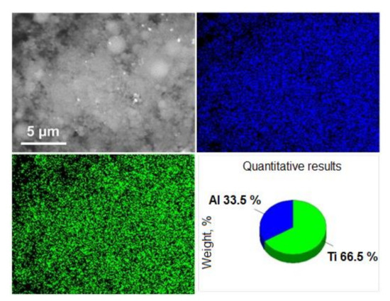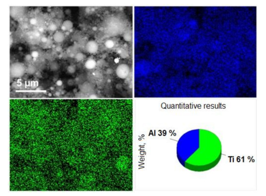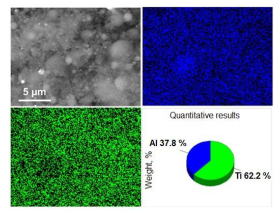 Typical images of Ti–Al composite particles and elemental analysis using EDS mapping are shown in Figure 4, Figure 5 and Figure 6. It follows from the powder images and analysis data that the samples consist of microparticles, submicron, and nanoparticles, and Al and Ti are homogeneously distributed in Ti–Al particles. It should be noted that particles larger than 100 nm are present in all samples.